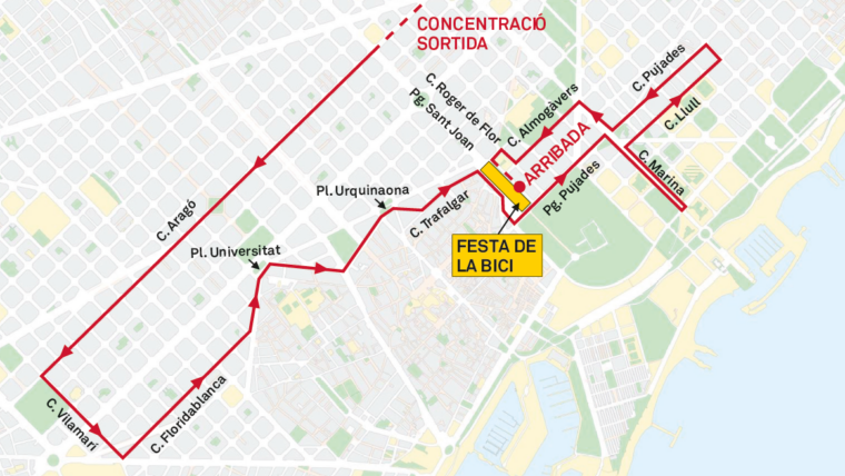 La Bicicletada, con más de 3.500 ciclistas previstos, empezará a las 10.00 h en la calle Aragó, entre el paseo de Sant Joan y la calle Sicília, y la pedalada se alargará por Aragó hasta la calle de Vilamarí, volverá por Floridablanca, pasando por pl. Universidad, pl. Urquinaona y paseo Pujades para terminar la ruta en el paseo de Lluís Companys.